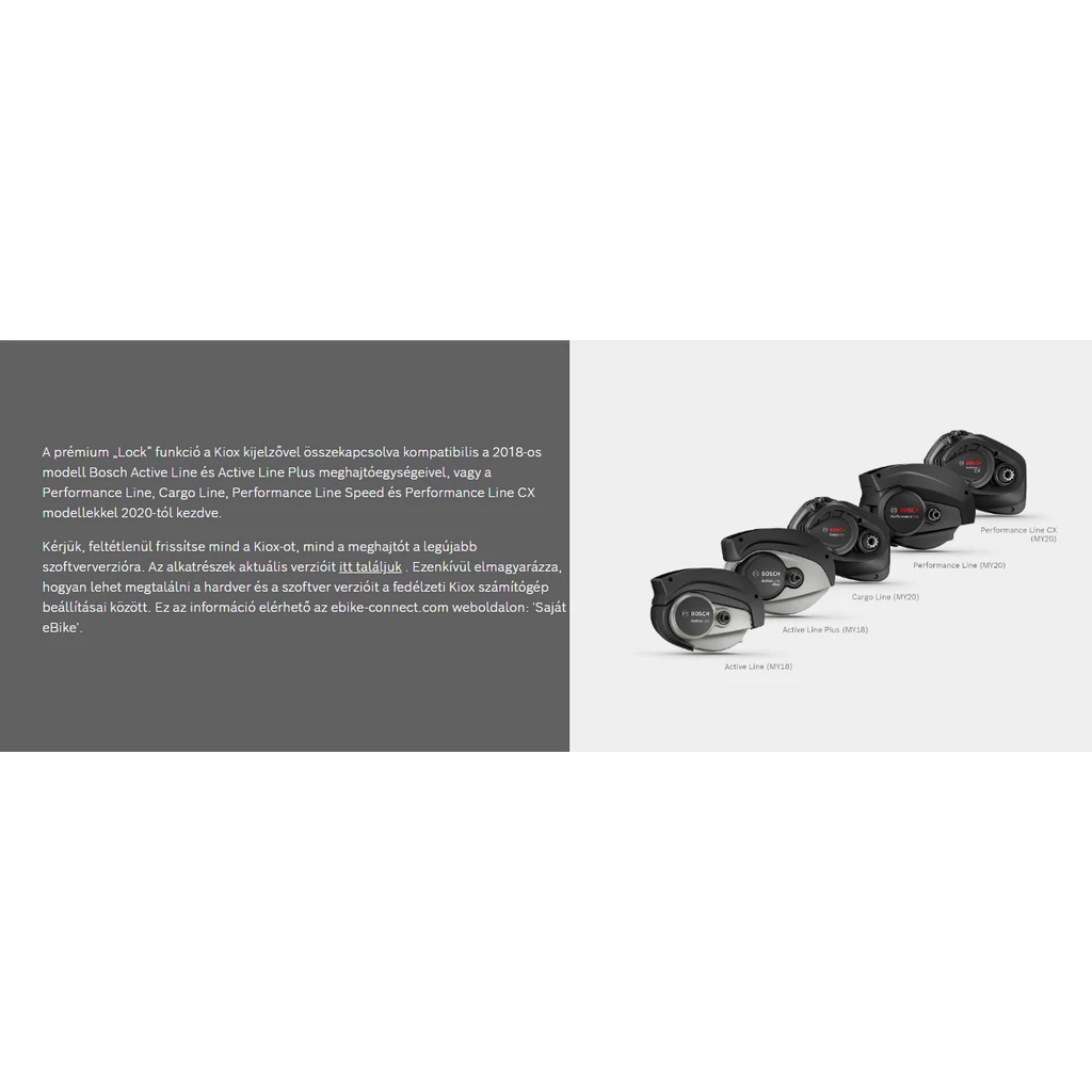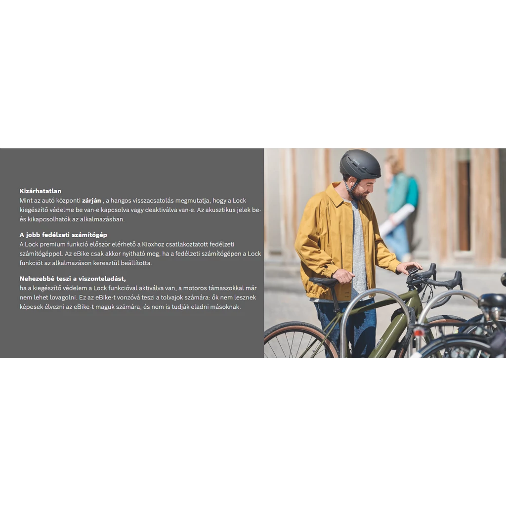 Parkolja le az eBike-t, és élvezze a kicsit gondtalan leállást - az eBike Connect okostelefon alkalmazás új 'Zár' prémium funkciója teszi a Kioxot a nagyobb biztonság kulcsává és további védelmet kínál. A zár lehetővé teszi a motor támogatásának kikapcsolását a fedélzeti számítógép eltávolításával. Csak ugyanazon fedélzeti számítógép csatlakoztatásával a zár automatikusan kinyílik. A kijelző és a hangjelzések jelzik, hogy a Lock aktív-e, és az eBike-t kiegészítő biztonságként őrzik. Így a zár ideális kiegészítő a mechanikus zárhoz. Ez egy zárolási funkció, amely alkalmazáson belüli vásárlás révén van beállítva.